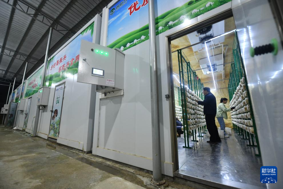 在广西百色市德保县城关镇那造村食用菌产业基地,驻村第一书记蒋士圳(左)和村民将菌棒上架(10月29日摄)。