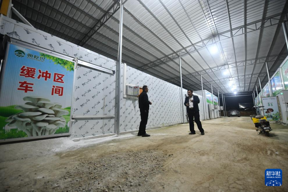 在广西百色市德保县城关镇那造村食用菌产业基地,驻村第一书记蒋士圳(右)和技术人员交流(10月29日摄)。