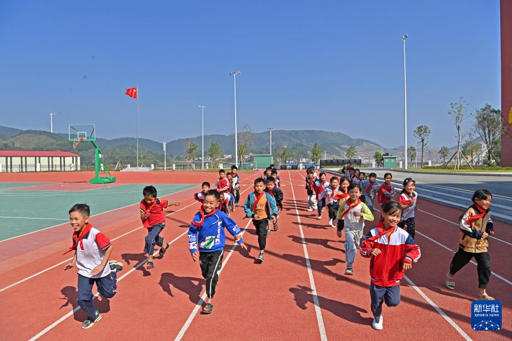 11月7日,孩子们在广西钦州市灵山县旧州镇石桥小学新校区跑步。