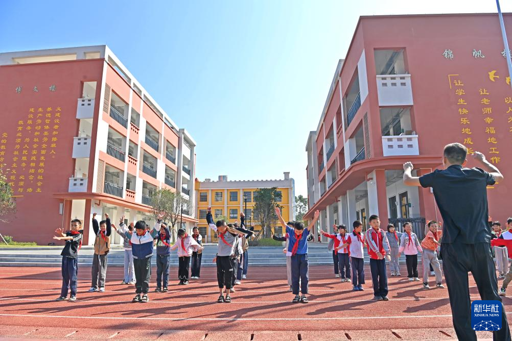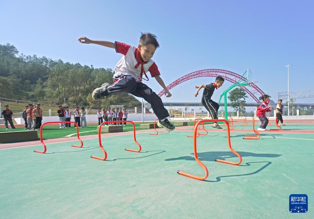 11月7日,孩子们在广西钦州市灵山县旧州镇石桥小学新校区上体育课。