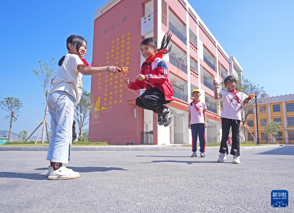 11月7日,孩子们在广西钦州市灵山县旧州镇石桥小学新校区跳绳。