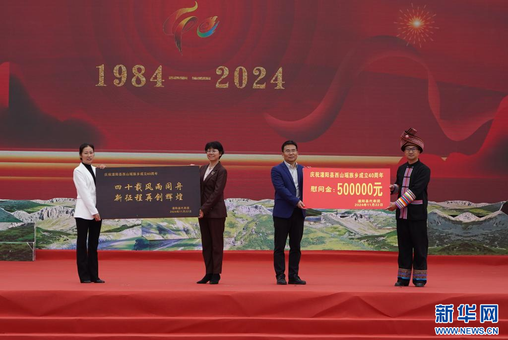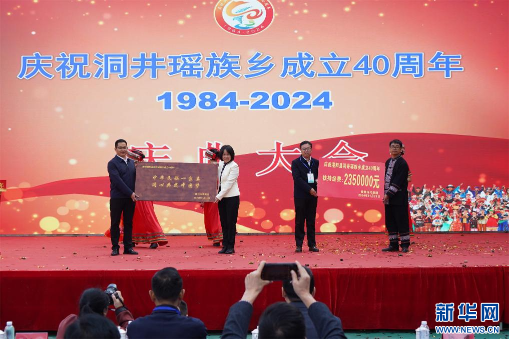 新华网南宁11月23日电(牙举成) 11月21日至22日,广西桂林市灌阳县洞井瑶族乡和西山瑶族乡举行成立40周年庆祝活动。自治区民宗委祝贺团、桂林市代表团、灌阳县代表团到场祝贺,桂林市代表团和灌阳县代表团分别赠送贺匾、贺礼。当地各族群众载歌载舞,话家乡发展变化,共庆家乡成立40周年。