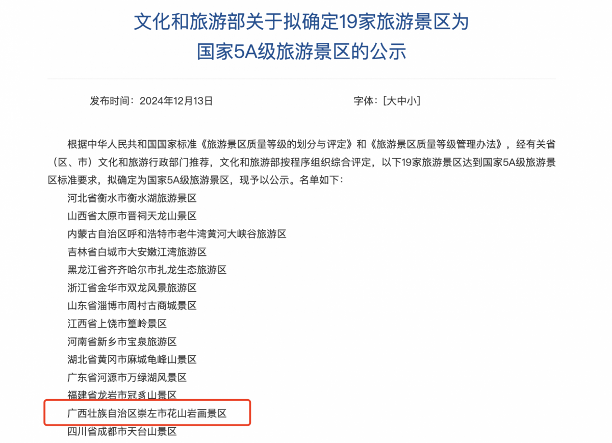 国家5A级旅游景区拟上新,广西5A景区或再增一员。12月13日,文化和旅游部发布《关于拟确定19家旅游景区为国家5A级旅游景区的公示》,其中,广西壮族自治区崇左市花山岩画景区上榜。