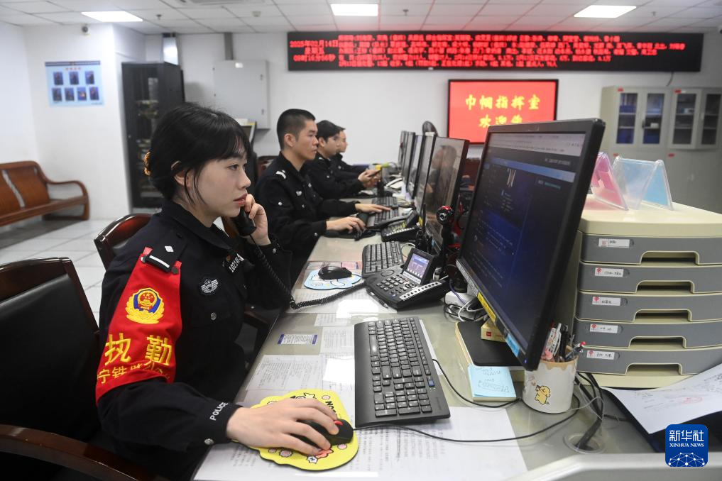 2月14日,在南宁铁路公安局南宁公安处南宁东站派出所,民警莫珊珊(左一)在接听旅客来电。