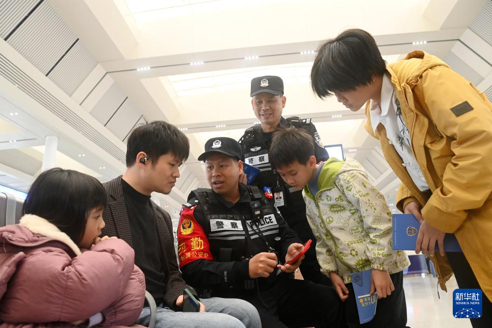 2月14日,在南宁东站,南宁东站派出所民警覃超强(左三)向旅客宣传反诈防骗知识。