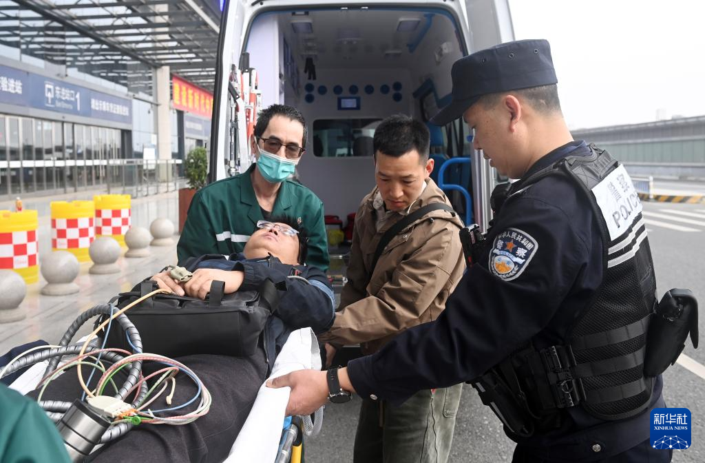 2月14日,在南宁东站,南宁东站派出所民警高明伟(右一)将一名突发身体不适的旅客抬上救护车。