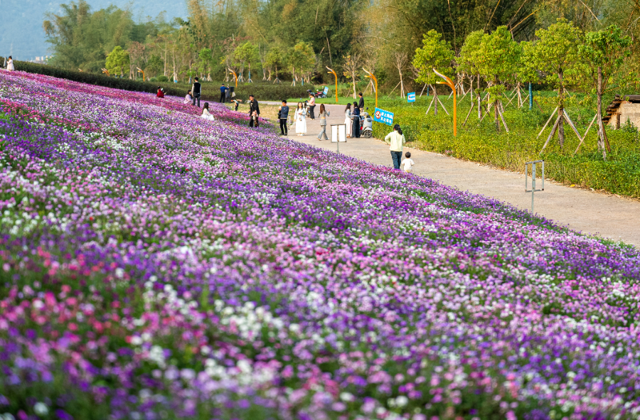 “一路繁花”带动了“赏花经济”不断升温。“广西三月三”期间,昭平县江滨北路2000米长的格桑花、美人樱大道宛如一条粉紫色丝带,点缀在桂江沿岸,慕名前来的游人三五成群,或悠然赏景,或驻足拍照定格精彩瞬间,尽享春的气息。