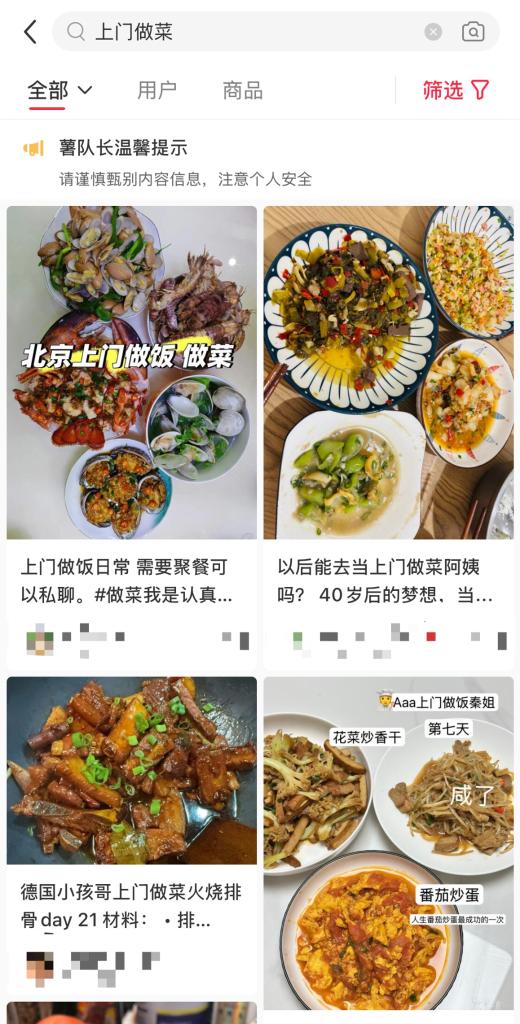 小红书上有关上门做菜的帖子。