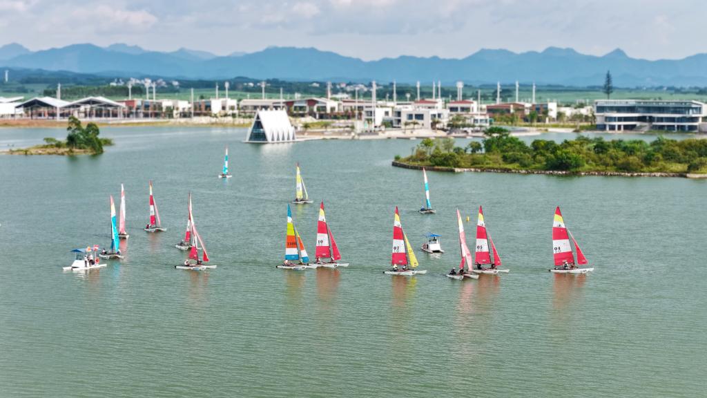 新华网南宁9月29日电(记者林凡诗)9月27日至28日,2025年广西帆船城市联赛(Hobie16级别)首站比赛在来宾市武宣县七星湖体育综合体举行。这场“江海湖全域帆船联赛”吸引了来自泰国、德国、加拿大、意大利、新西兰等国家和地区的32支帆船队参赛。