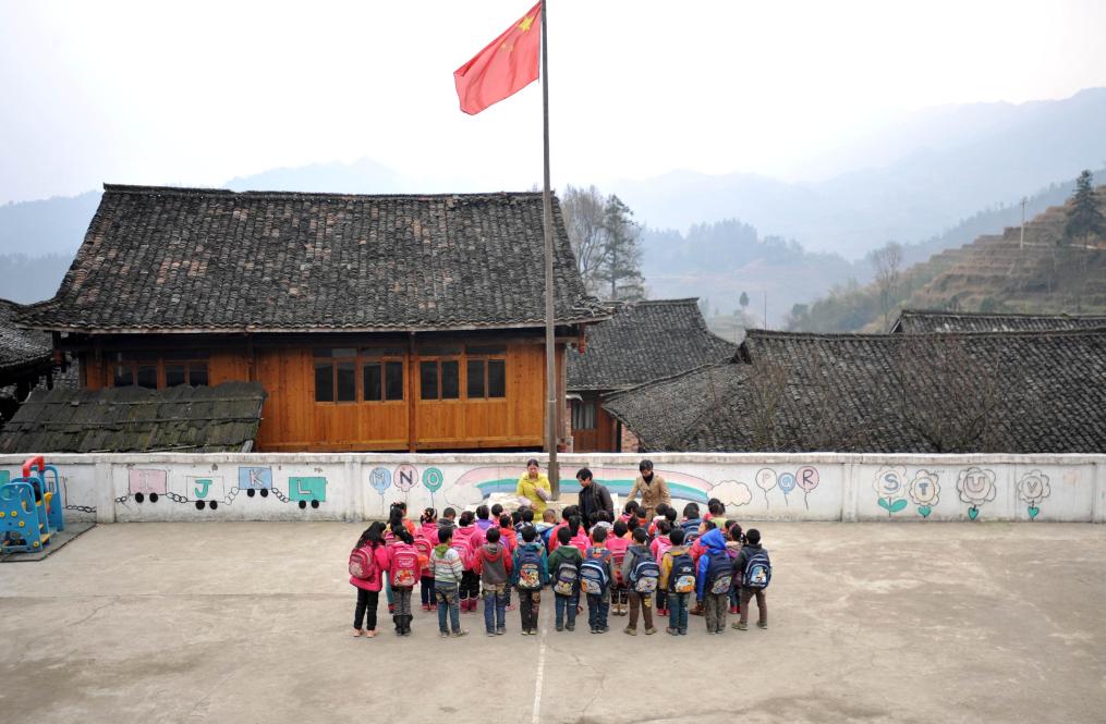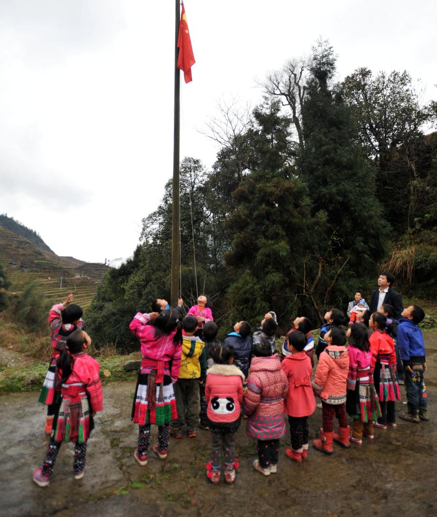 大山教学点,很多学校只有小学一到三年级学生,有的只有一、二年级几个小孩。由于学生幼小,无法独自担当升旗手,很多老师不管年龄多大,都要自己担当这个神圣的角色,扛起国旗站到旗杆下跟着国歌的节拍,拉着手中的绳子抬头仰望国旗升起。