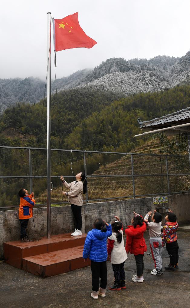 山头白雪皑皑,檐下冰凌滴水。严寒的天气里,一位老师领着六个学生在校园里唱国歌、升国旗,老师和一名学生作为升旗手,五名学生站成一排,向正在升起的国旗行队礼和注目礼。升旗仪式结束后,国旗在校园上空高高飘扬,那抹最神圣的中国红不仅温暖了寒风中的学校,还温暖了学校所在的山寨。
