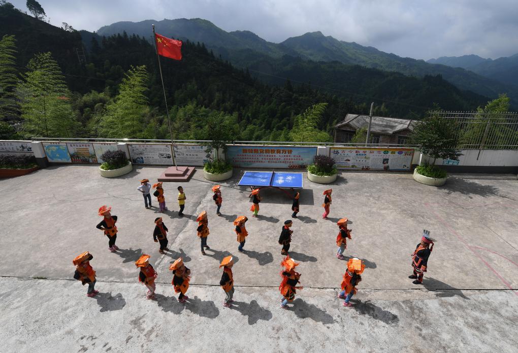 在广西金秀瑶族自治县忠良乡山界教学点,学校唯一的老师陶凤英领着学生做操(2019年6月4日摄)。