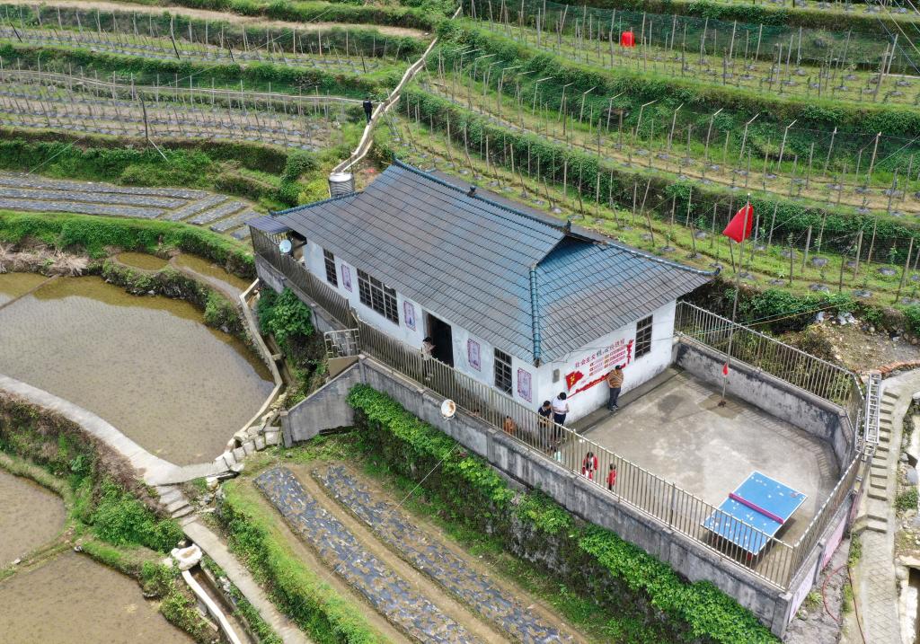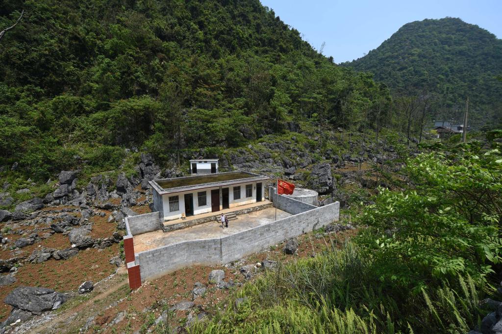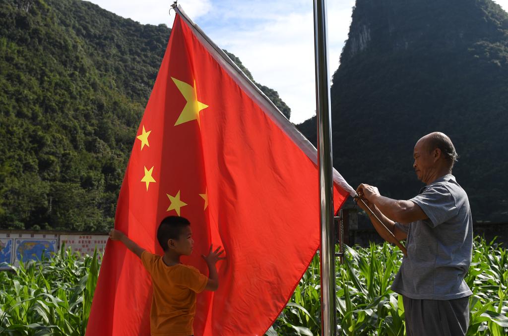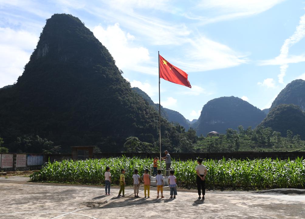 五星红旗飘扬在广西灵川县兰田瑶族乡深潭教学点(2023年5月18日摄)。