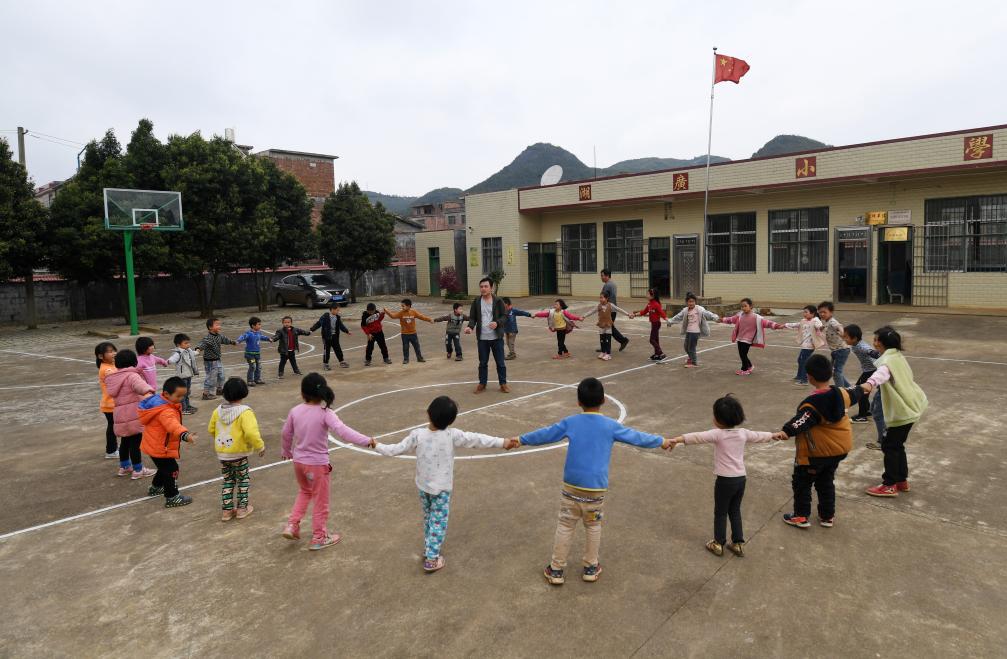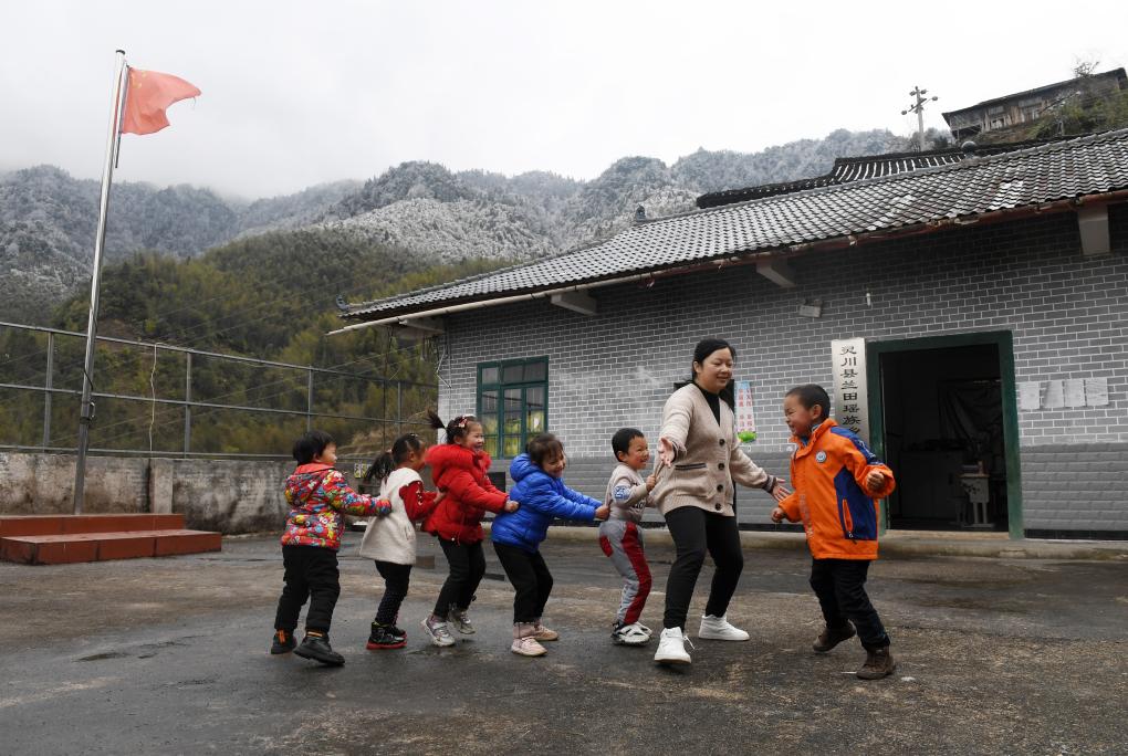 在广西灵川县兰田瑶族乡东良教学点,石夏月老师和学生在做游戏(2022年2月24日摄)。