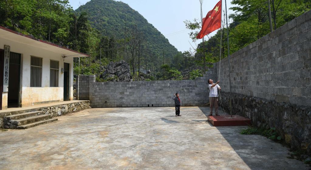 在广西都安瑶族自治县菁盛乡义德小学弄豆教学点,学校唯一的老师蓝启飞(右)和唯一的学生蓝孟源在升国旗(2015年4月15日摄)。