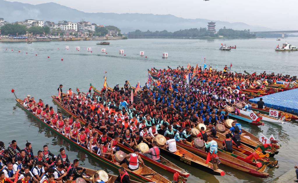 1日,2025年广西融安龙舟公开赛暨第二十四届长安龙舟大赛在融江上激烈进行。江面龙舟竞渡,两岸观众呐喊助威,气氛热烈。