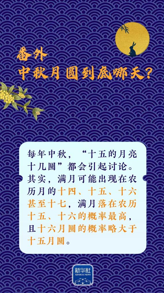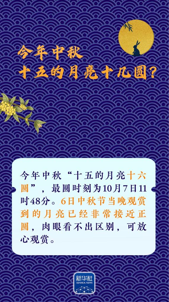 新华社南京10月4日电(记者王珏玢、邱冰清)10月6日将迎中秋佳节。这个阖家团圆的节日,赏月是无可争议的重头戏之一。今年中秋,十五的月亮十几圆?月亮有啥特殊看点?讲究什么“姿势”?还有什么“彩蛋”?请收下这份中秋赏月指南,科学赏月,做好攻略→
