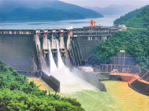 受连续台风影响,百色水利枢纽从10月1日凌晨开启闸门泄洪,将持续到10月10日左右。图为泄洪现场。游拥军/摄