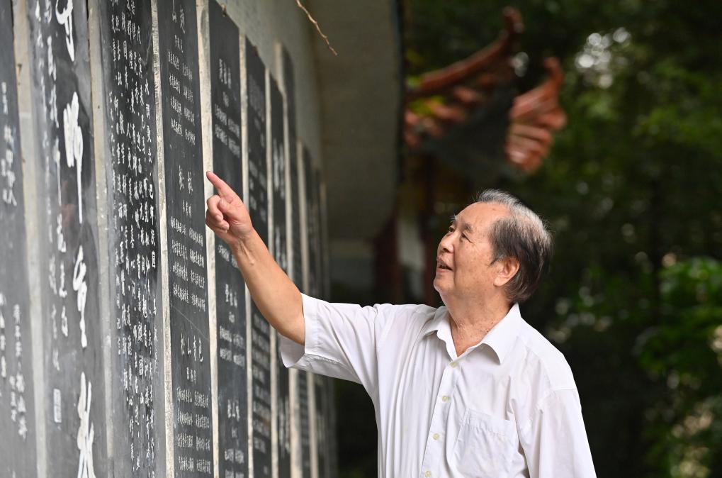 10月15日,在广西河池市巴马民族师范学校桂岭碑林长廊,罗伏龙在浏览诗词和书法作品。