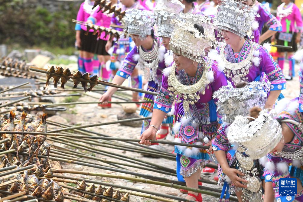 10月18日,在柳州市融水苗族自治县梦呜苗寨,村民在展示烧鱼文化。