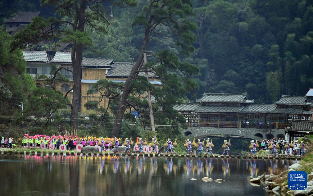10月18日,在柳州市融水苗族自治县安太乡培秀村,村民们展示稻渔文化。