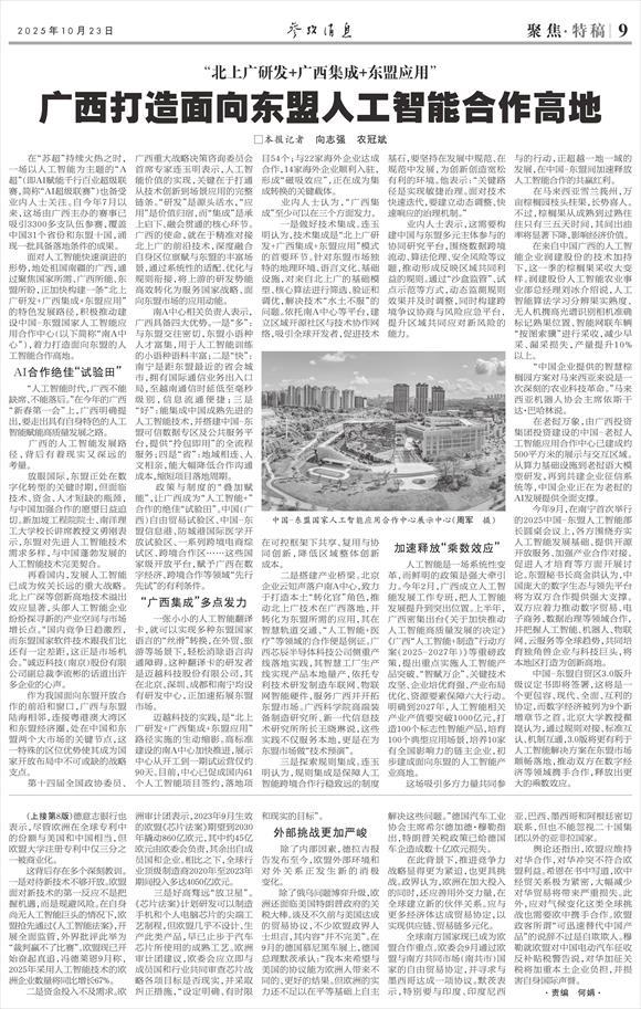 政策与制度的“叠加赋能”,让广西成为“人工智能+”合作的绝佳“试验田”。中国(广西)自由贸易试验区、中国-东盟信息港、防城港国际医学开放试验区、一系列跨境电商综试区、跨境合作区……这些国家级开放平台,赋予广西在数字经济、跨境合作等领域“先行先试”的有利条件。