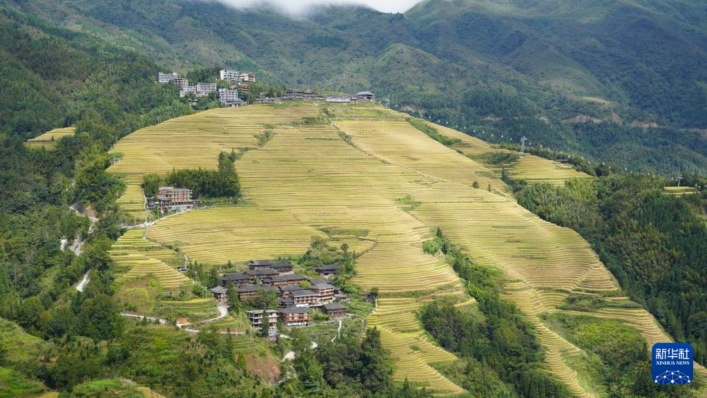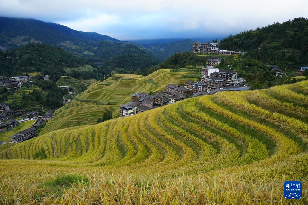 十月的广西,秋意正浓。位于桂林市龙胜各族自治县的龙脊梯田稻浪翻滚,漫山遍野的金黄稻穗沿着山势层层铺展,吸引游客拍照留念。