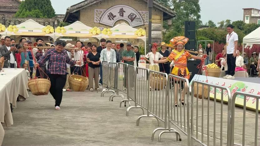 “丰收能手”挑百香果竞速比赛现场。黎泽鹏 摄