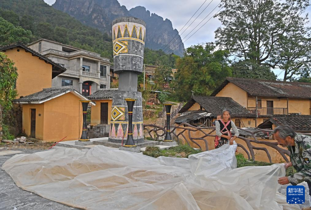 村民在广西金秀瑶族自治县六巷乡下古陈村用塑料布遮盖晾晒的粮食(10月28日摄)。新华社记者 周华 摄