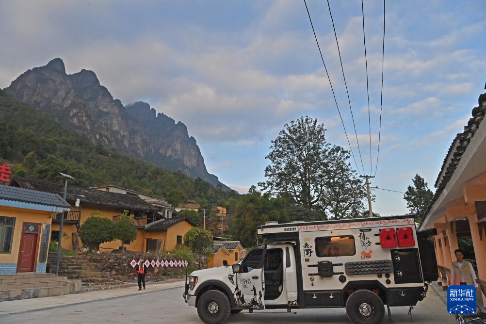 游客在广西金秀瑶族自治县六巷乡下古陈村准备在房车上过夜(10月28日摄,无人机照片)。新华社记者 周华 摄