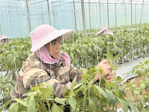 温室大棚里,女工在吊蔓上缠绕辣椒枝干。记者沈程/摄
