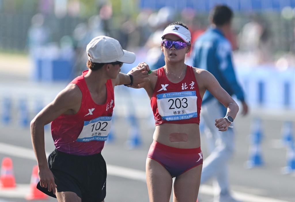 上午进行的马拉松竞走混合接力决赛中,由石升吉和杨家玉组成的北京队以2小时58分01秒的成绩夺冠。