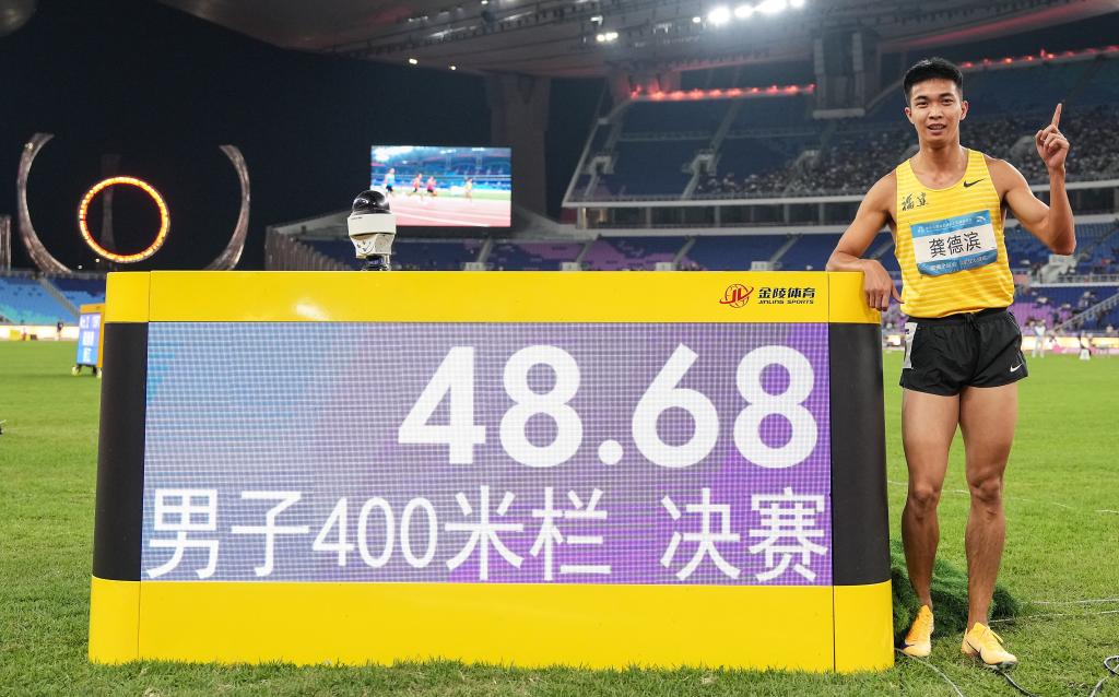 男子400米栏比赛中,龚德滨跑出48秒68,创造全国纪录。原纪录保持者、河南队选手谢智宇获得银牌。