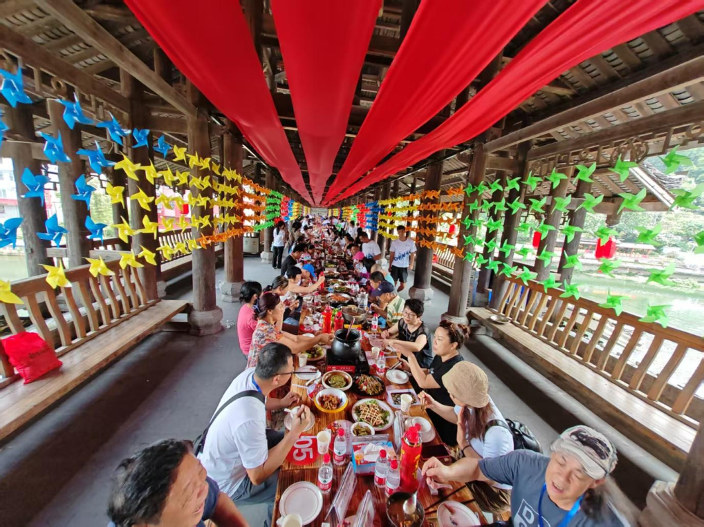 游客在体验长桌宴。资源县融媒体中心供图