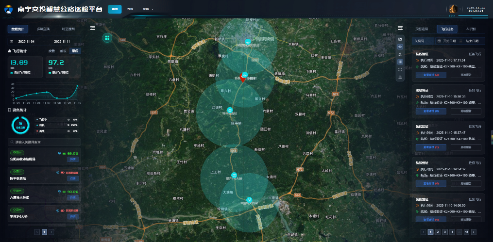 六宾高速全长约45.6公里,沿线地形复杂、结构物密集,传统人工巡检存在效率低、盲区多、安全风险大等痛点。南宁高速公司联合技术单位,引入基于无人机机巢集群的智能巡检系统,在全线布设5座无人机机场,形成“一机场一无人机”的协同部署,实现“自动起飞—精准巡航—智能识别—数据分析—自动回传”全流程无人化作业。