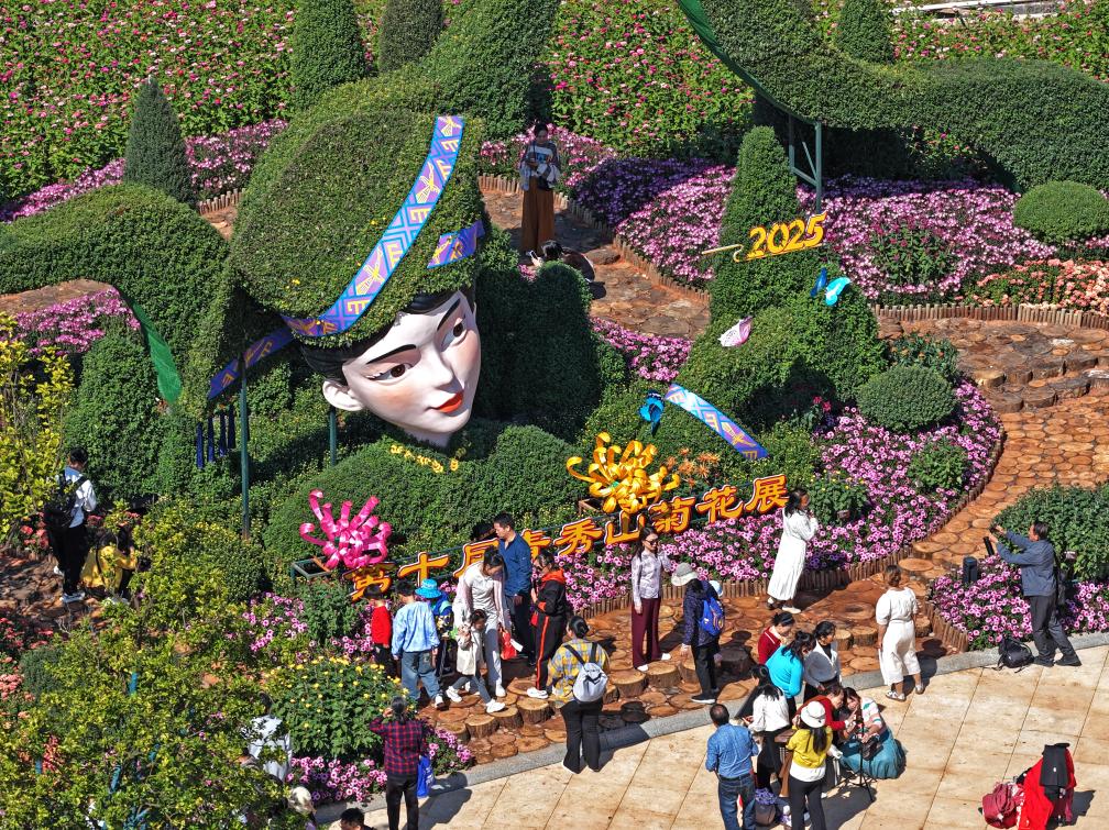 11月22日,市民在广西南宁市青秀山风景区欣赏菊花(无人机照片)。