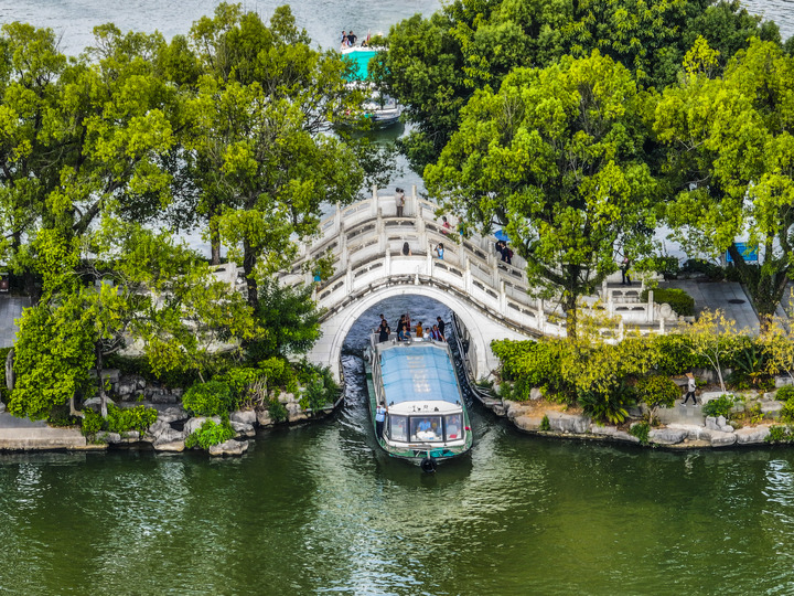10月3日,游客在广西桂林市榕湖乘船游览。新华社发(刘峥 摄)