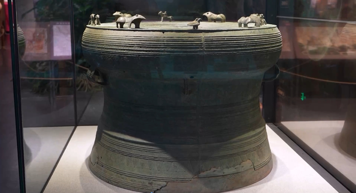 这是广西民族博物馆日前展出的三国乘骑水鸟饰变形羽人纹铜鼓。新华社记者 覃广华 摄