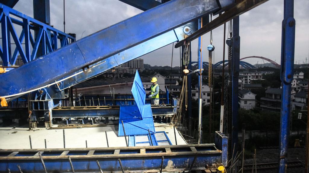 工人正在平陆运河项目沿线铁路桥改建工程上作业。新华社记者张爱林 摄