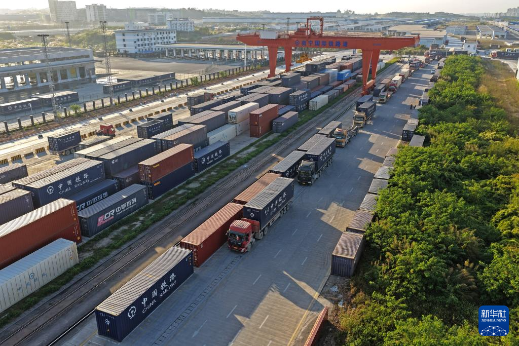 一列中越班列驶出南宁国际铁路港(11月28日摄,无人机照片)。