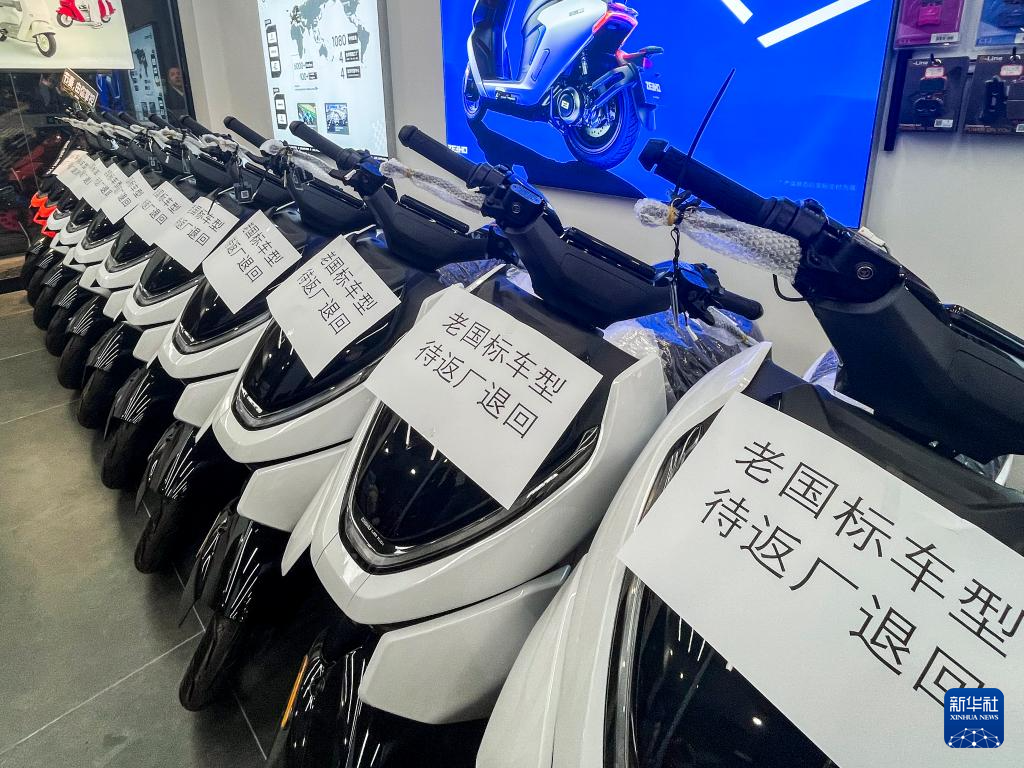 12月1日,上海市中心一家电动自行车销售门店内停放了多辆待返厂旧国标电动自行车(手机照片)。该门店工作人员表示,新国标车辆预计月底才有货。