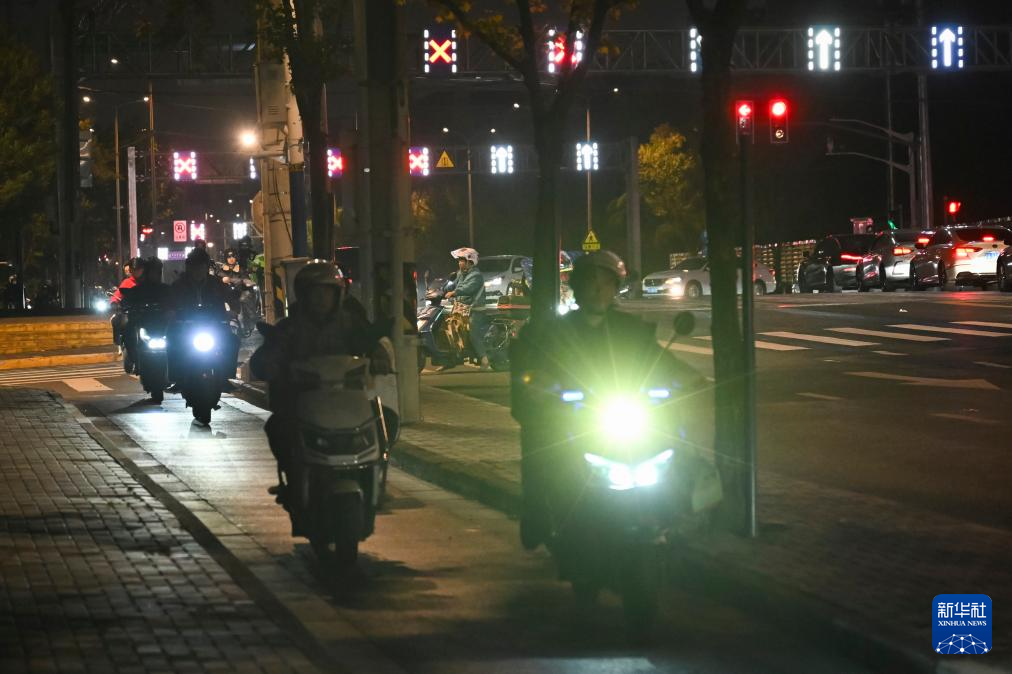 11月14日,在上海市郊一处路口,部分电动自行车的车灯令人眩目。