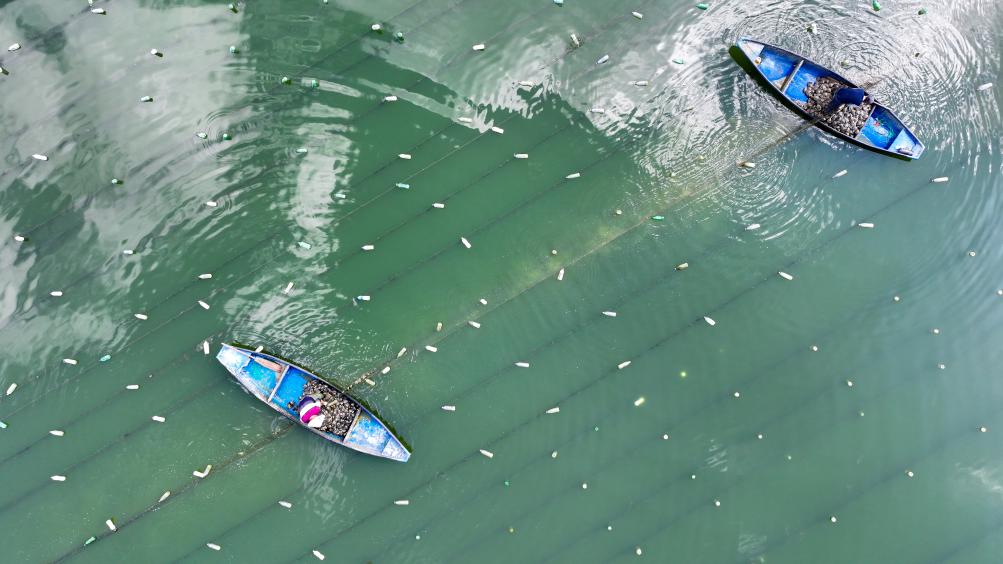 一串串珍珠蚌悬于水下,工人划船穿梭其间开展作业。(陆敏 摄)