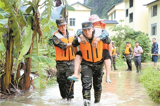 10月下旬,受台风“桦加沙”“博罗依”“麦德姆”接连影响,河池市多地区发生严重内涝。图为武警官兵在巴马瑶族自治县西山乡巴纳村转移受困村民,确保人民群众生命财产安全。 (自治区应急管理厅供图)