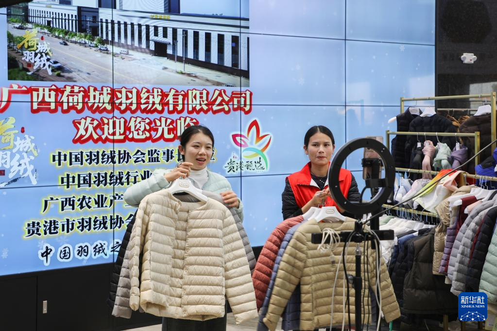 在广西贵港市港南区桥圩镇一家羽绒制品生产企业,工作人员通过直播平台销售羽绒服(12月18日摄)。