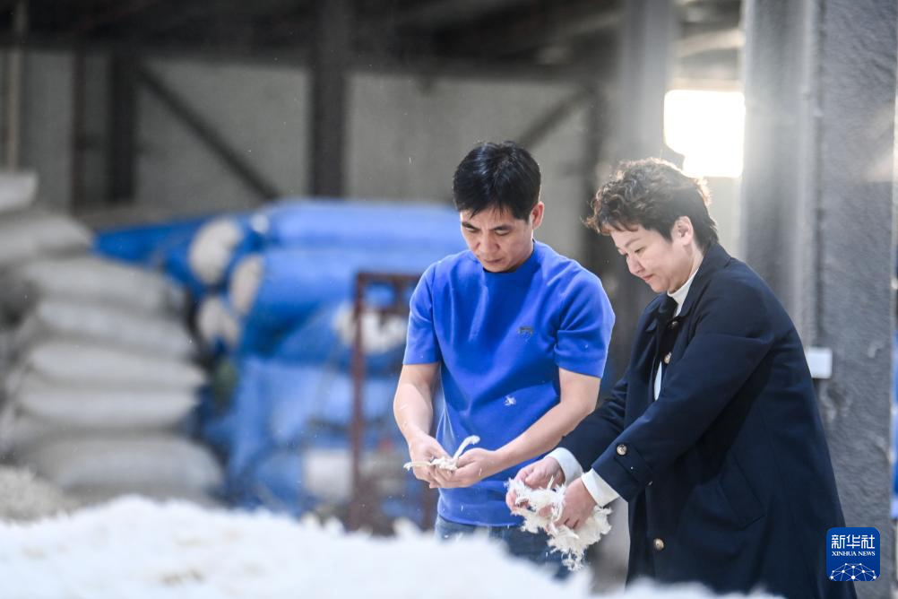 在广西贵港市港南区桥圩镇一家羽绒制品生产企业,工作人员检查收购的原料毛品质(12月18日摄)。