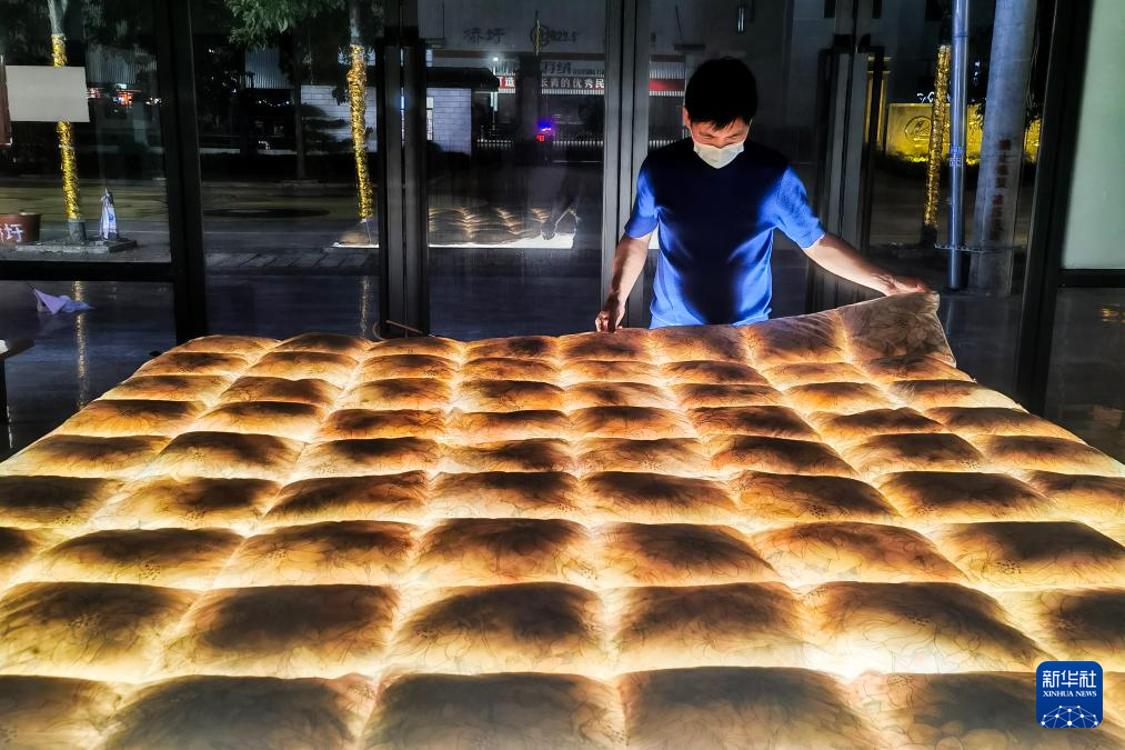 广西贵港市港南区桥圩镇一家羽绒制品生产企业的工作人员在检查羽绒被的充绒情况(12月18日摄)。