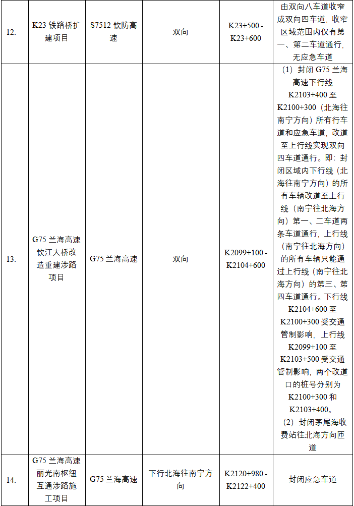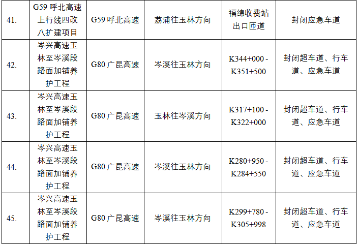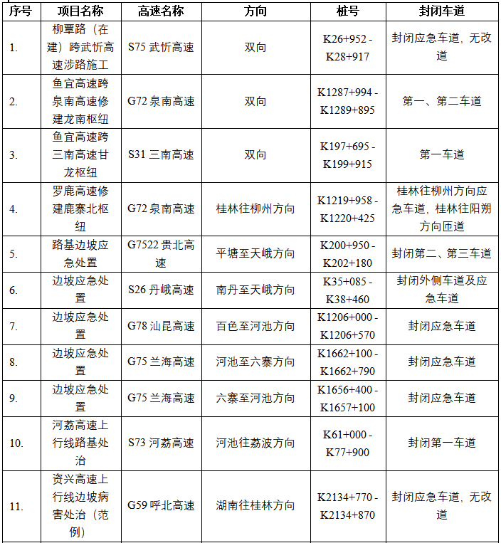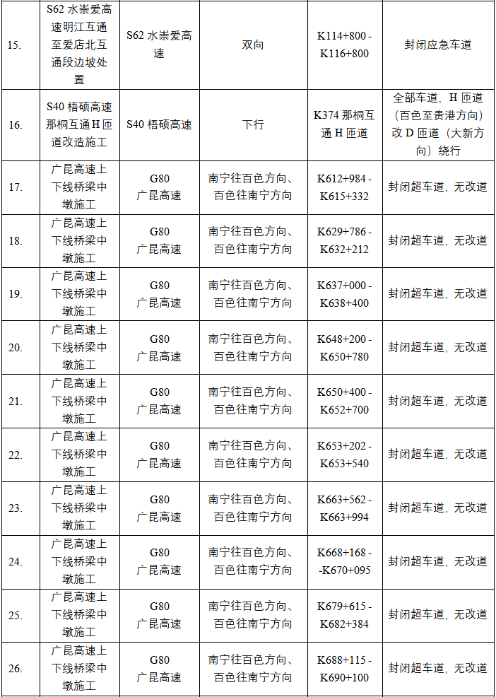 有S75武忻高速K26+952-K28+917(双向),柳覃路(在建)跨武忻高速涉路施工;G72泉南高速K1287+994-K1289+895鱼宜高速跨泉南高速修建龙南枢纽45处涉路施工区不能撤离,易因通行能力下降导致拥堵缓行。元旦节期间,原则上不允许施工,紧急抢修危及行车安全的设施或严重路面病害的除外,抢修路段请看链接:广西高速公路出行信息服务网。