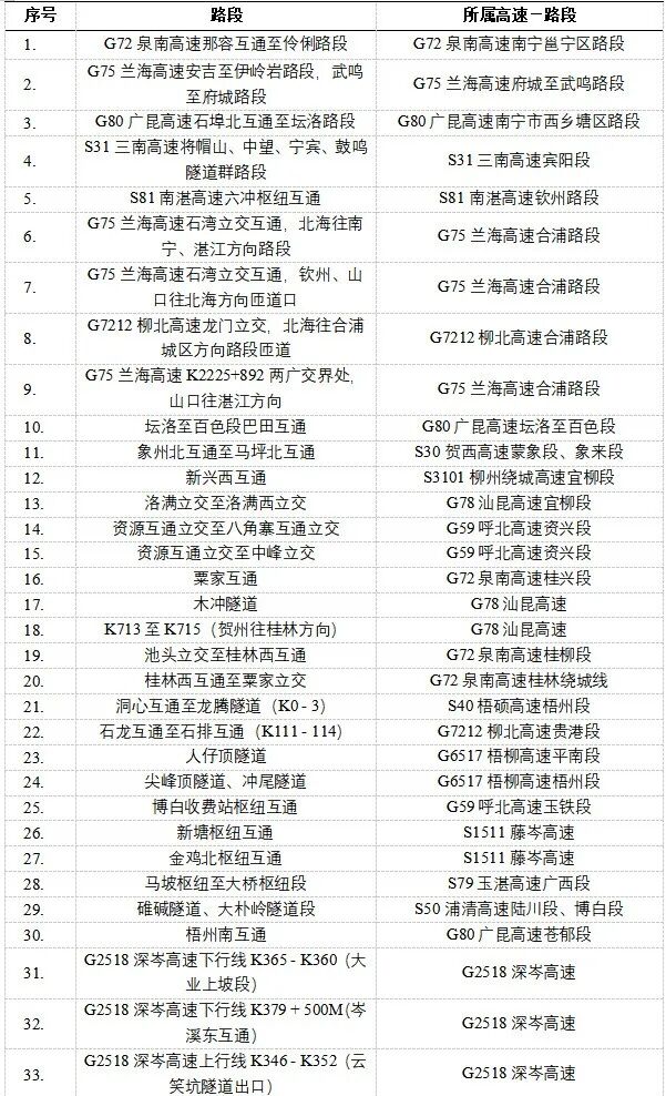 泉南高速那容互通至伶俐路段、兰海高速安吉至伊岭岩路段武鸣至府城路段、广昆高速石埠北互通至坛洛路段等33个路段(枢纽互通)易发生拥堵缓行。