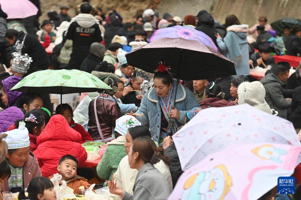 1月20日,苗族群众和游客同享百家宴。